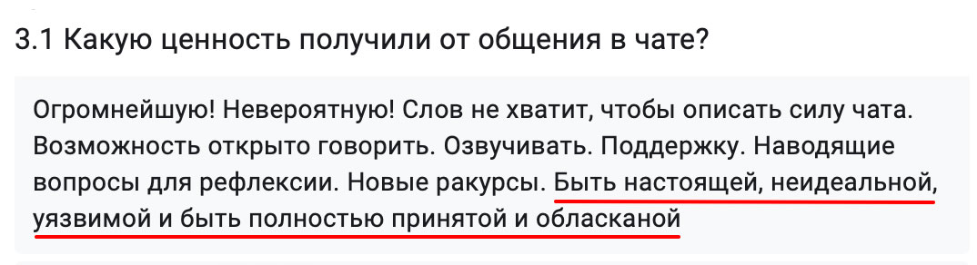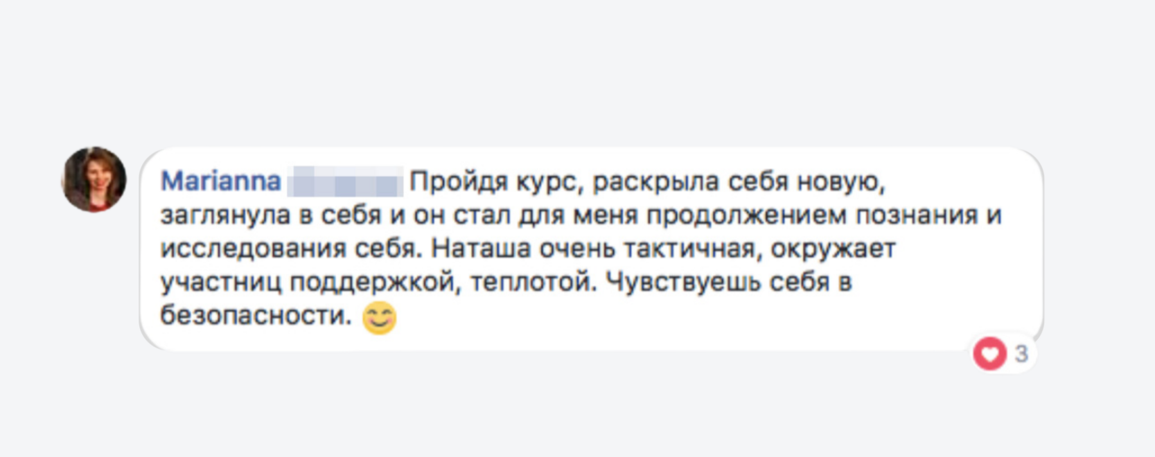 А если серьезно, то я получила гораздо больше, чем ожидала. Наталье удалось создать настоящую группу поддержки, и для меня архиважным стало открытия, что я не одна такая. Со своими проблемами, страхами, болью физической и моральной. Огромное спасибо Наталье и другим участницам за то, что делились очень личным. Было и грустно, любопытно, и весело. Я смогла раскрепоститься, стало проще вслух проговаривать многие вещи. Мое тело теперь может донести до меня, чего же ему надо для счастья. И дело не в точке G или в какой-то "секретной" позе - все, как всегда, оказалось "в голове". И в связи головы с телом. В очередной раз я убедилась, как важно дыхание, как важно слушать и доверять себе. И да, в данном случае надо стать эгоисткой на 100% - вот это было очень трудно принять, но вроде получается потихоньку. Муж тоже видит разницу, говорит, что я стала более открытой в постели и ему нравится, как я реагирую на его желание доставить мне удовольствие. Так что еще и семейная терапия получилась! )